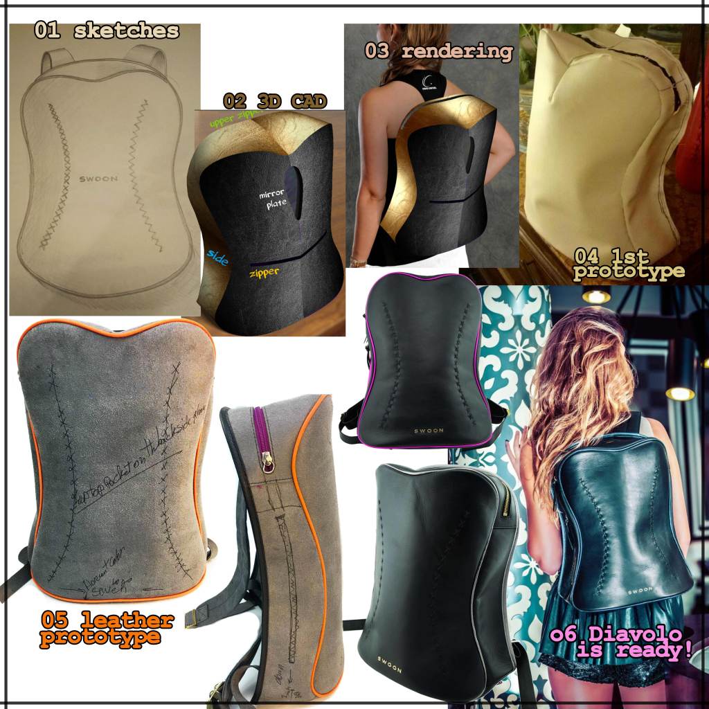 Diavolo is by far my favorite project. A limited production leather backpack designed for Swoon Luxe brand based in Los Angeles. The idea behind it is that the backpack design follows the female silhouette: wider shoulders and hips, slim waist. It hasn’t been an easy task because it must carry a notebook therefore the initial extreme styling yielded to function during the process.