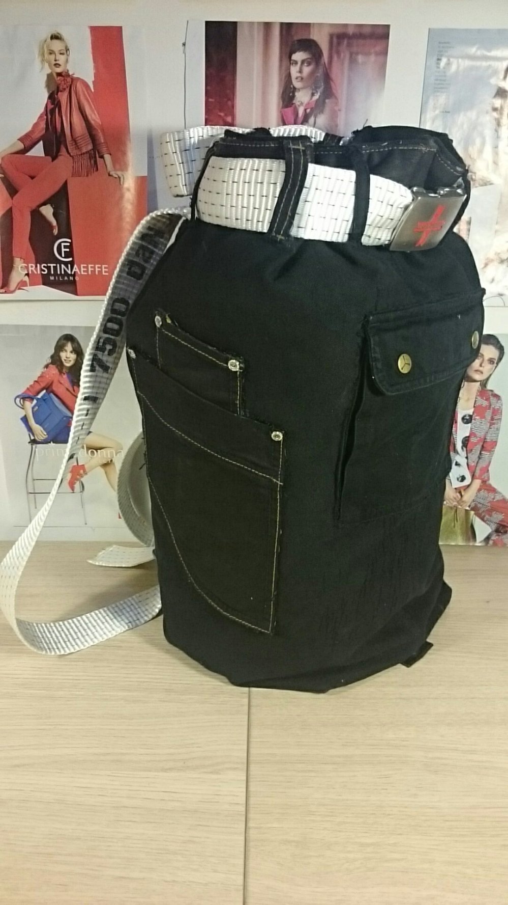 100% cotton multipocket backpack specifically sized to be a carry-on baggage. There are as much pockets as needed during a trip the way items and papers (boarding pass, passport, cell phone, metro card/airtrain, custom declaration form) are handy. Its deliberately rough look underscores the main qualities: strength and durability but with an eye on streetwear style.